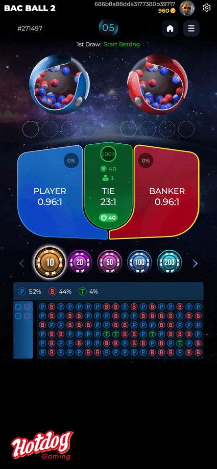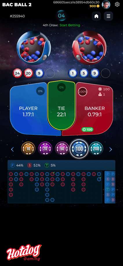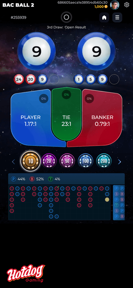 Bac Ball 2 is an exciting and strategic game featuring two sets of 30 balls—one for the Player and one for the Banker. The game consists of four draws, with the previously drawn balls excluded in subsequent draws, thereby reshaping the betting odds at every draw. The objective is to predict and place bets on the winning option in each draw.
