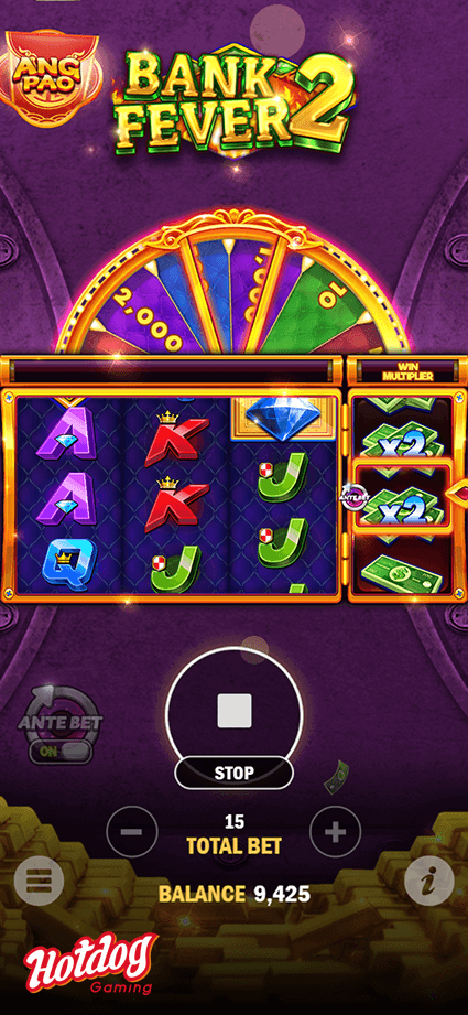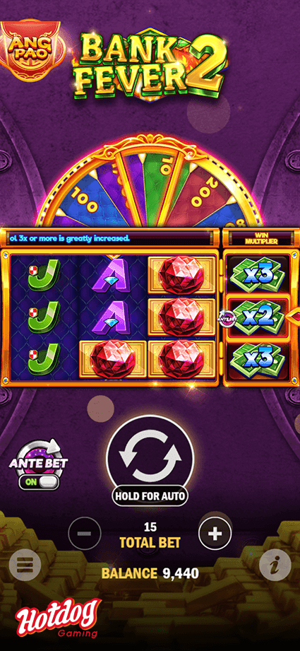 Bank Fever 2 brings back your favorite 3 by 3 Slot with crazy multiplier wins but with an additional feature of Fortune Wheel. Activating the ante bet will unlock multipliers in the fortune wheel board and win up to 1500x.