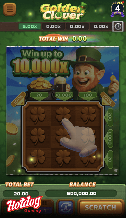 Welcome to Golden Clover! Enter a Scottish world of luck and chase treasures hidden in a 3x3 grid. Scratch across eight winning lines, and if you reveal a pot of gold, the prize on that line is yours. With every line full of possibilities, fortune may shine with every scratch?ill you find your golden clover today?