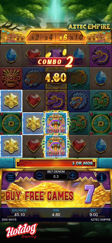Welcome to the aztec Empire ! In the free game, the 3rd reel will be filled with Golden Symbols, and you'll have a chance to get an extra 10x multiplier here.