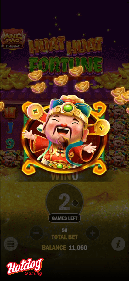 Huat Huat Fortune features an Expanding Wild as long as players hit 2 Cai Shen Wild in the same row. Enter the Free Game and win big with easy Wild Expand.