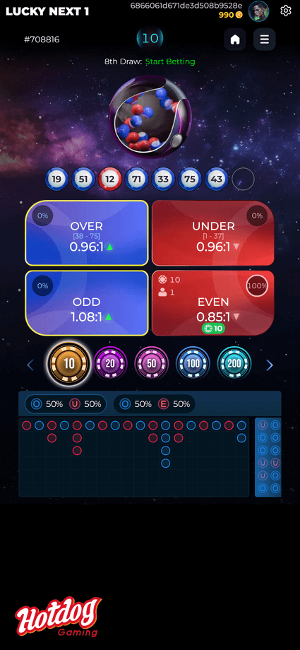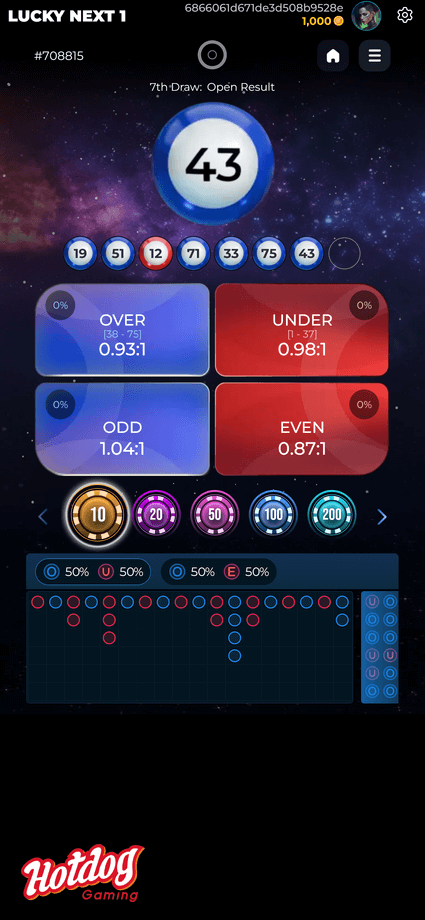 Lucky Next 1 is a strategic game featuring a set of 75 numbered balls. With eight draws in total, the chance to get big wins is higher as previously drawn balls are excluded, reshaping the betting odds at every draw. The objective is to predict the winning option and place your bets in each draw.