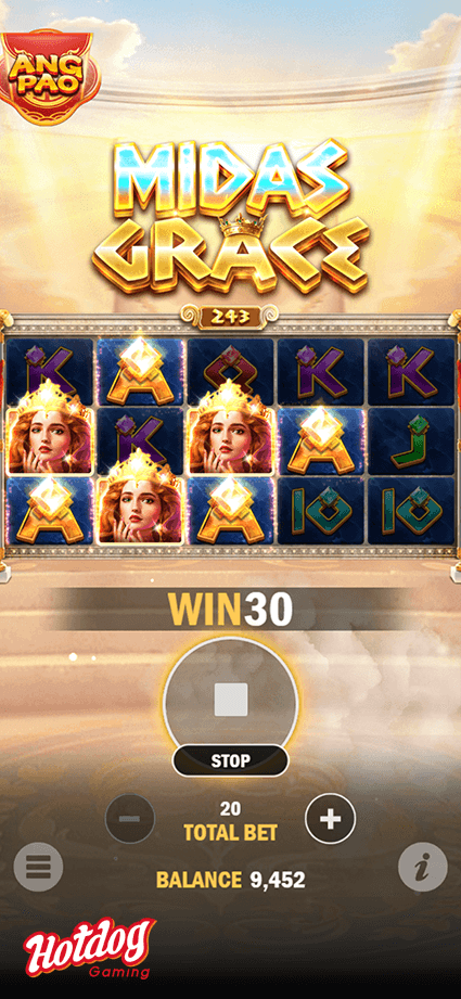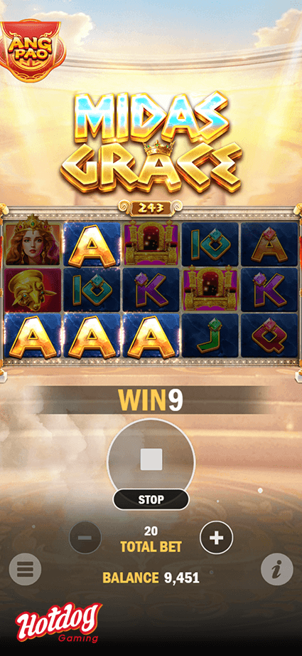 Midas rule his kingdom with a golden touch. Spin your way to an abundance of gold in this 243 ways slot. Midas will periodically appear and trigger a respin game with his golden touch, not only that, he may decide to upgrade your respin game symbol as he wishes to grant you a mega big win!