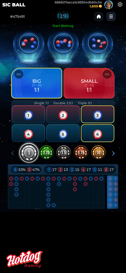 Sic Ball is an exciting game featuring three sets of balls, each set consisting of six balls numbered from 1 to 6. In each round, three balls are drawn randomly, allowing players to place bets on their preferred options before any balls are drawn.